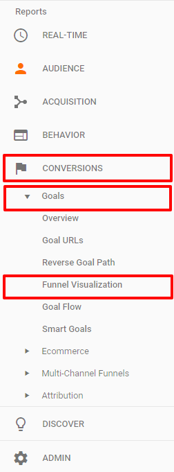 Here’s an example from the Google analytics menu after clicking the “Conversions” section. Then, selecting “Goals” and “Funnel Visualization.”